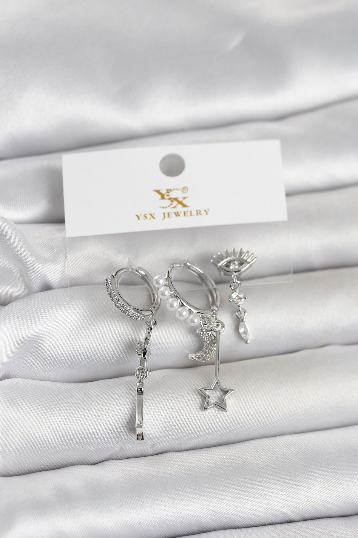 Pirinç Gümüş Renk Zirkon Taşlı Gece Temalı 3’lü Kadın Küpe