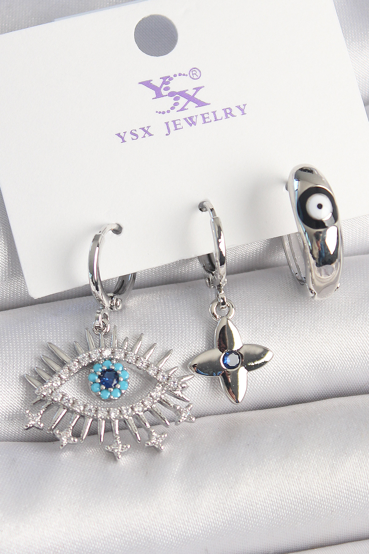 Pirinç Gümüş Renk Zirkon Taşlı Göz Model Nazar Boncuk Detay 3’Lü Kadın Kombin Küpe