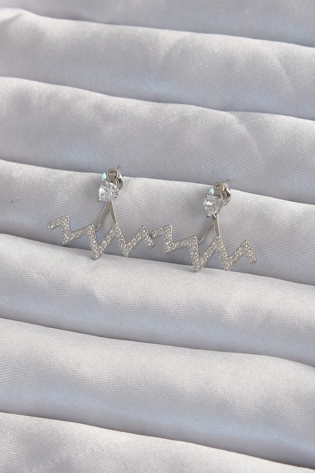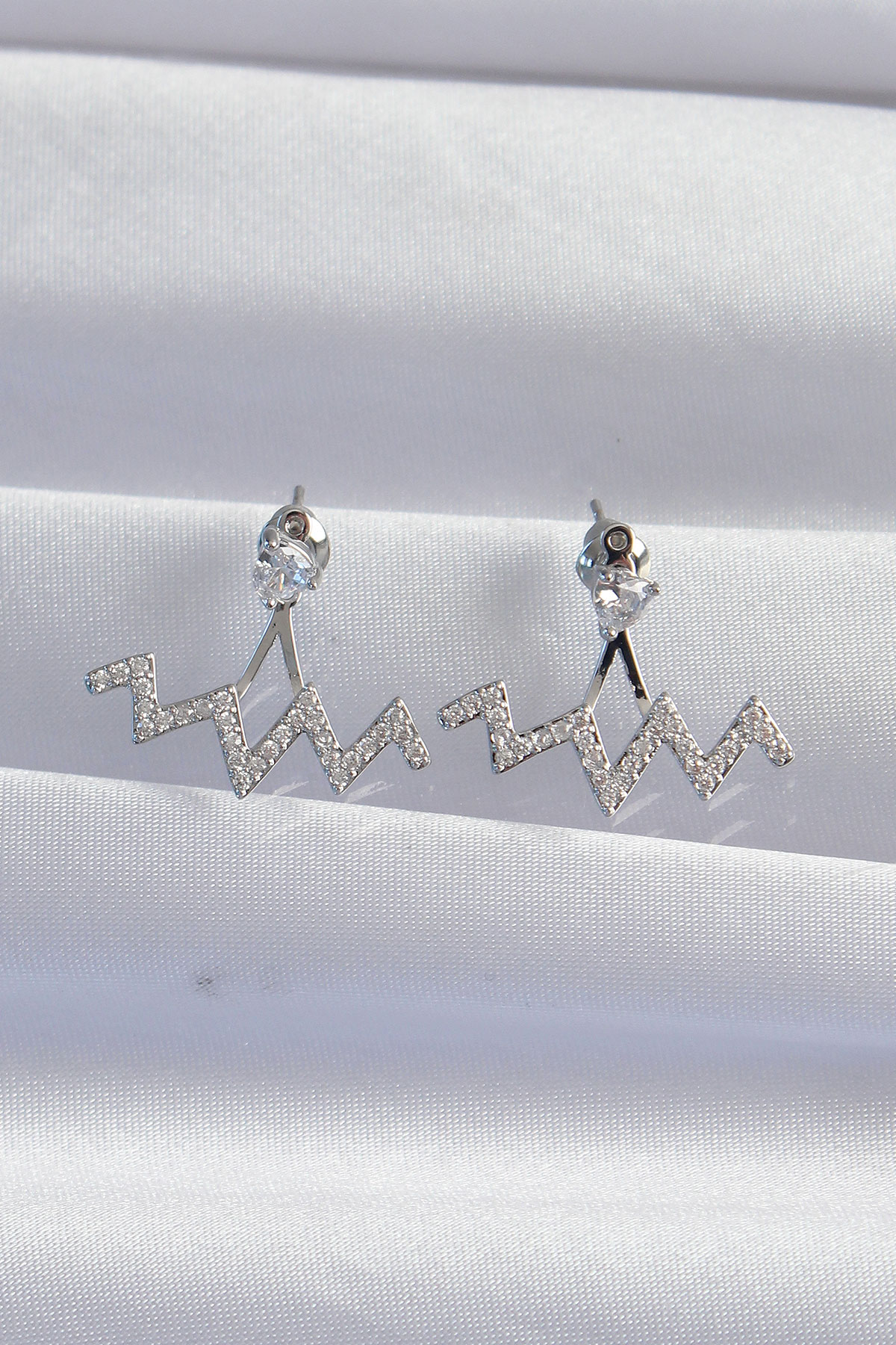 Pirinç Gümüş Renk Zirkon Taşlı Zikzak Küpe