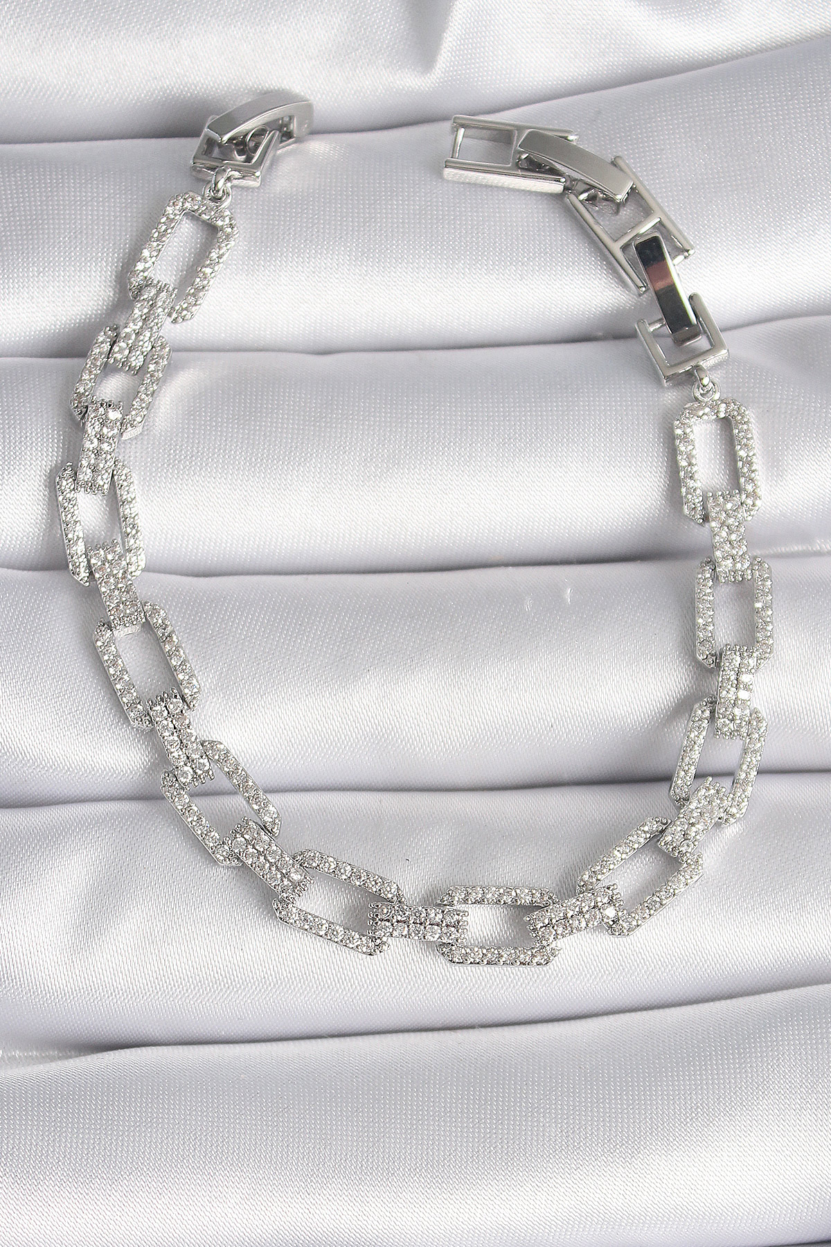 Pirinç Gümüş Renk Zirkon Taşlı Zincir Model VIP Seri Kadın Bileklik