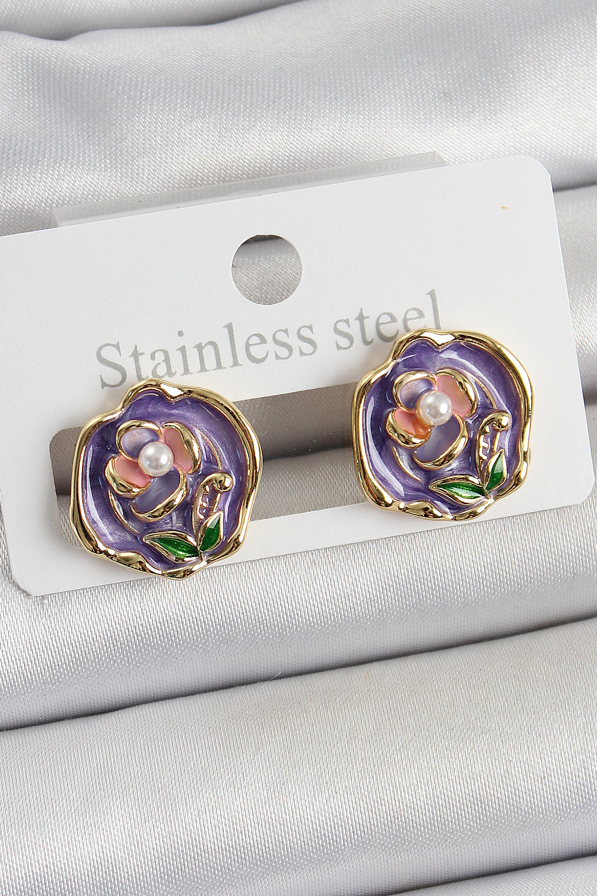 Pirinç Mor Mineli Çiçek Figürlü Sanatsal Portre Model Gold Renk Kadın Küpe