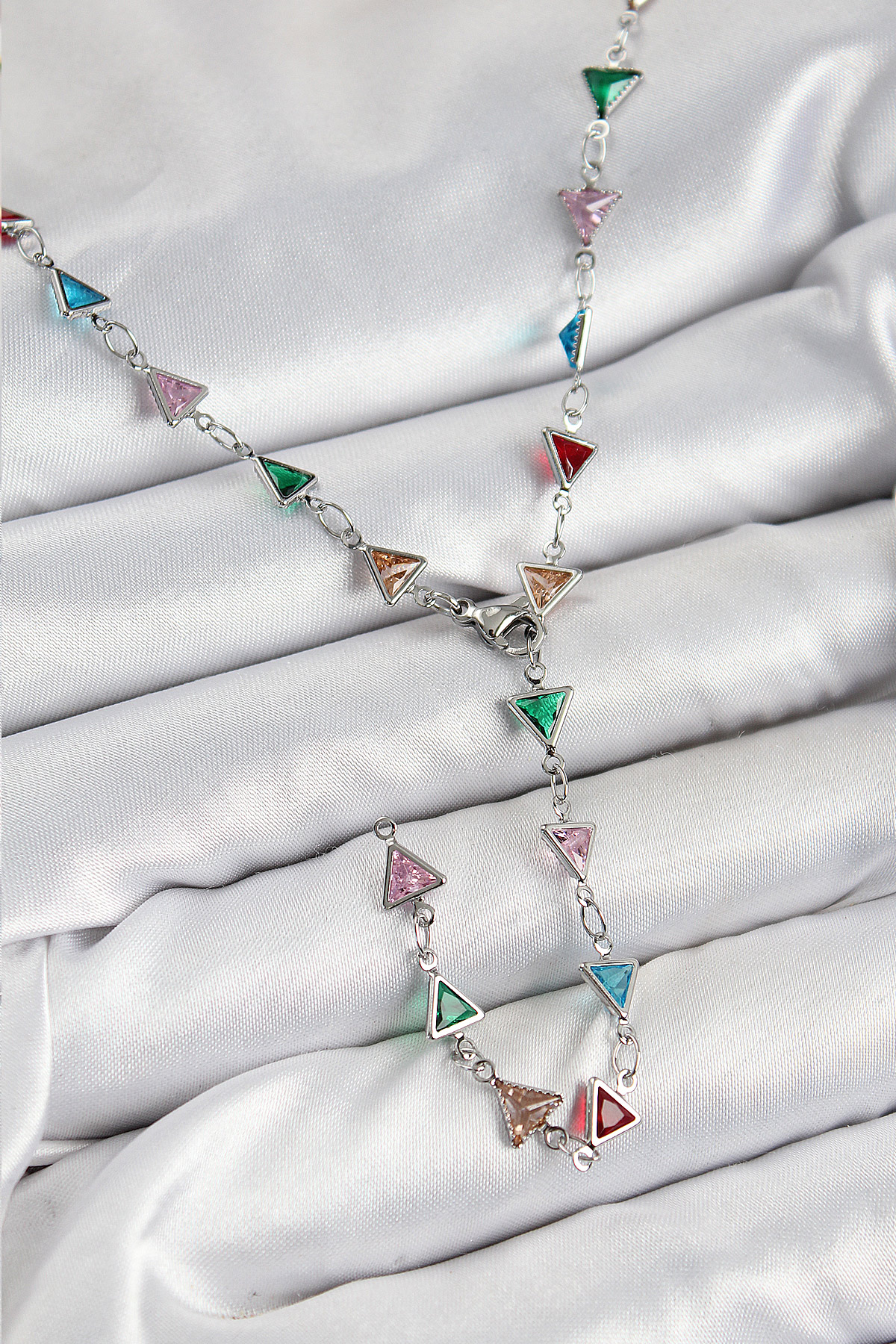 Pirinç Renkli Zirkon Taşlı Üçgen Model Gümüş Renk Kadın Y Kolye