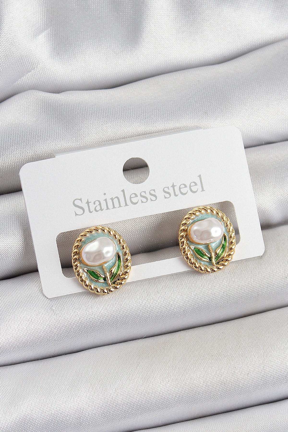 Pirinç Yeşil Mineli Lale Figürlü Sanatsal Portre Model Gold Renk Kadın Küpe