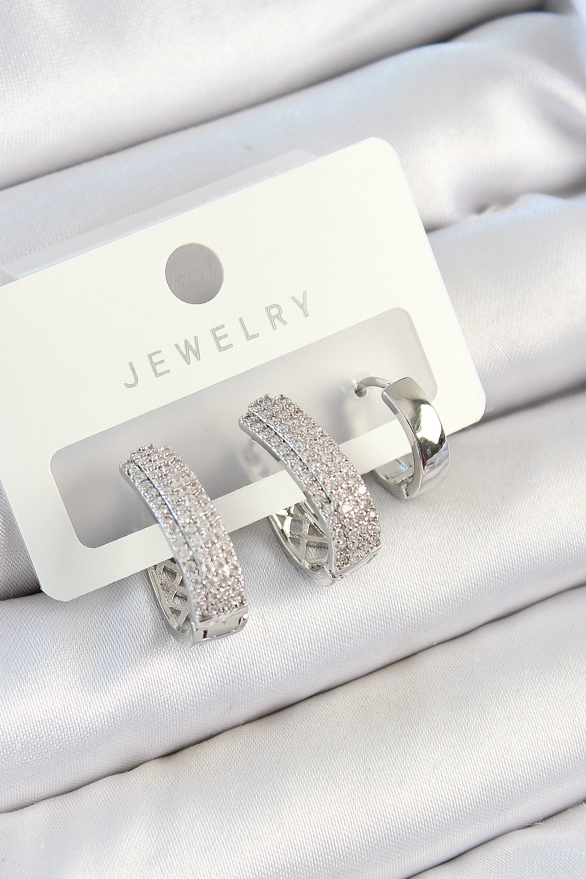 Pirinç Zirkon Taşlı Damla Model Gümüş Renk 3’lü Çift Kadın Küpe Set