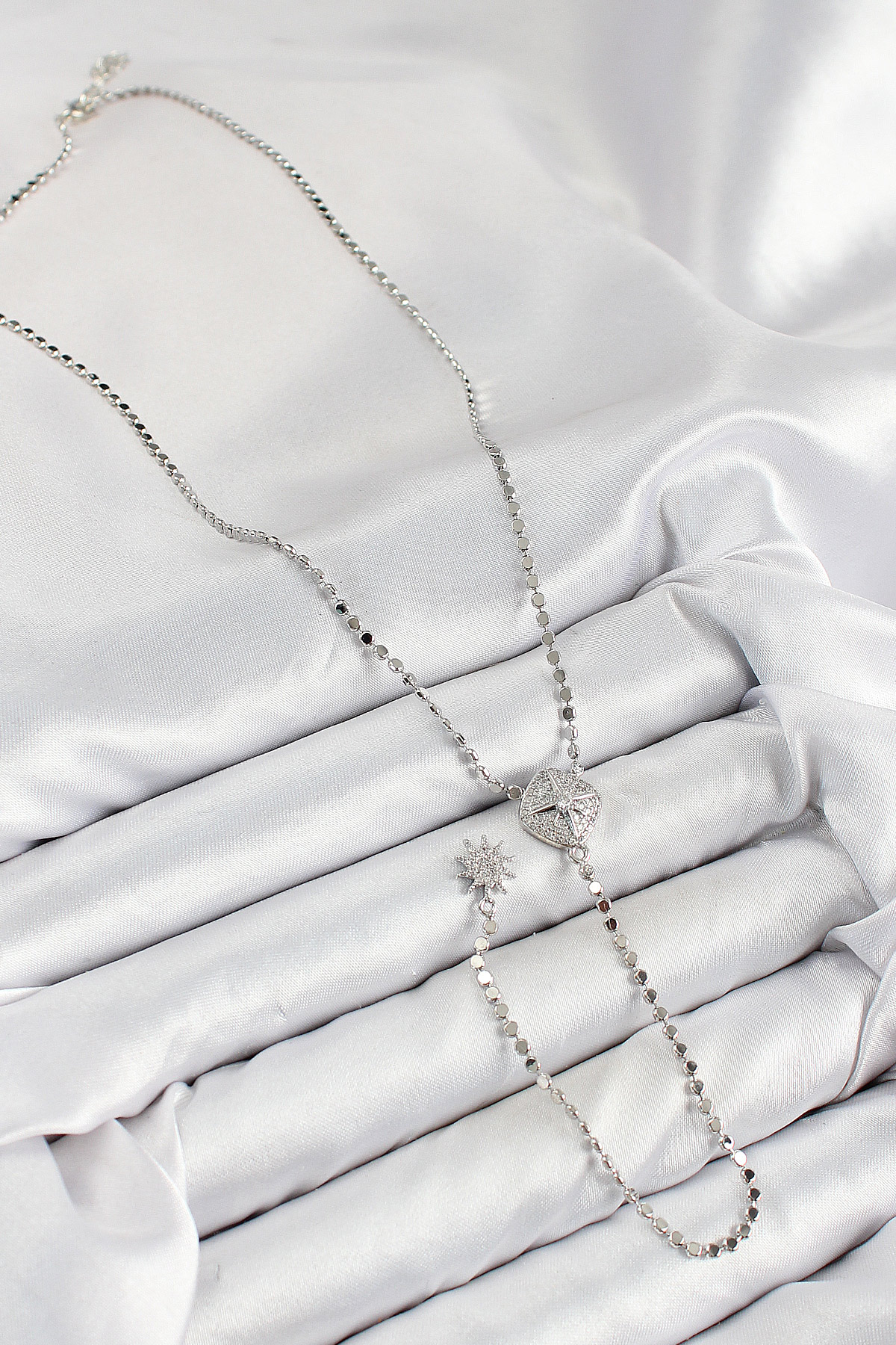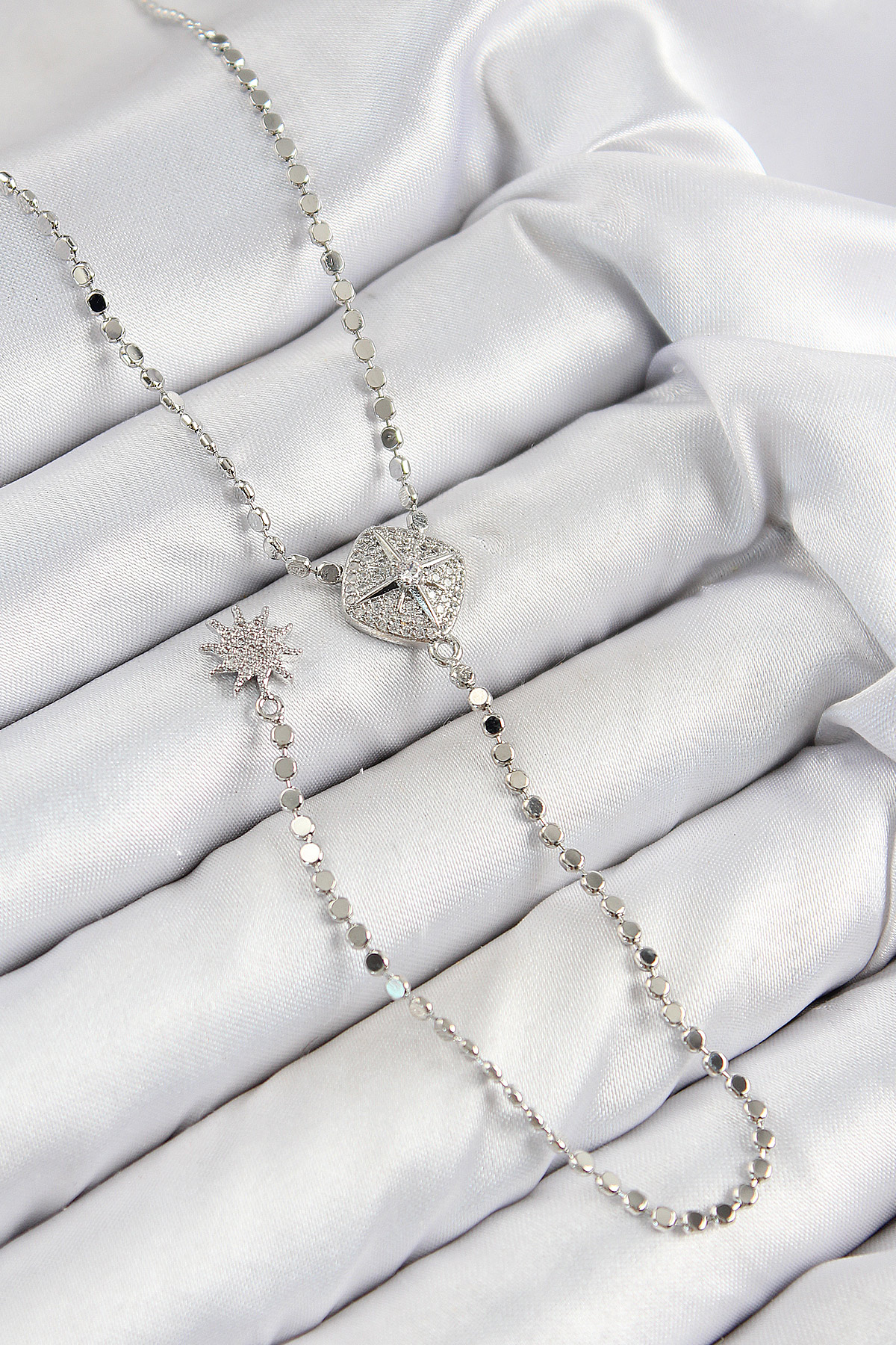 Pirinç Zirkon Taşlı Ezme Zincirli Madalyon Model Gümüş Renk Y Kolye