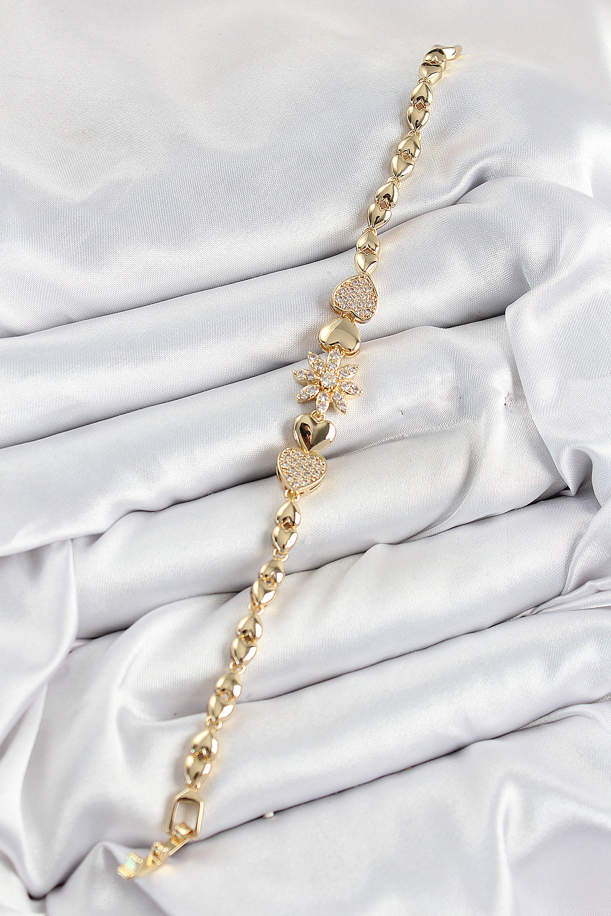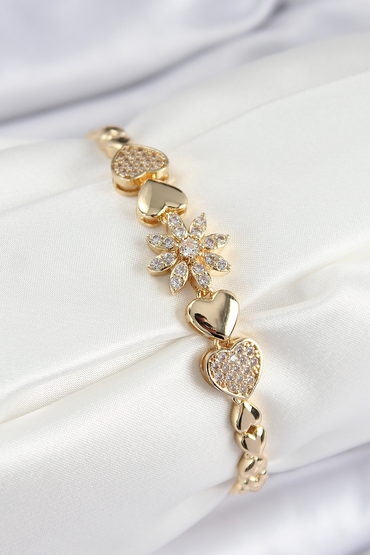 Pirinç Zirkon Taşlı Kalp Detaylı Çiçek Model Gold Renk Kadın Bileklik