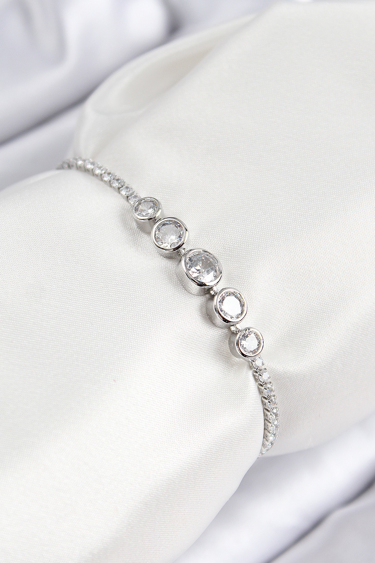 Pirinç Zirkon Taşlı Sıralı Daire Model Gümüş Renk Asansörlü Kadın Bileklik