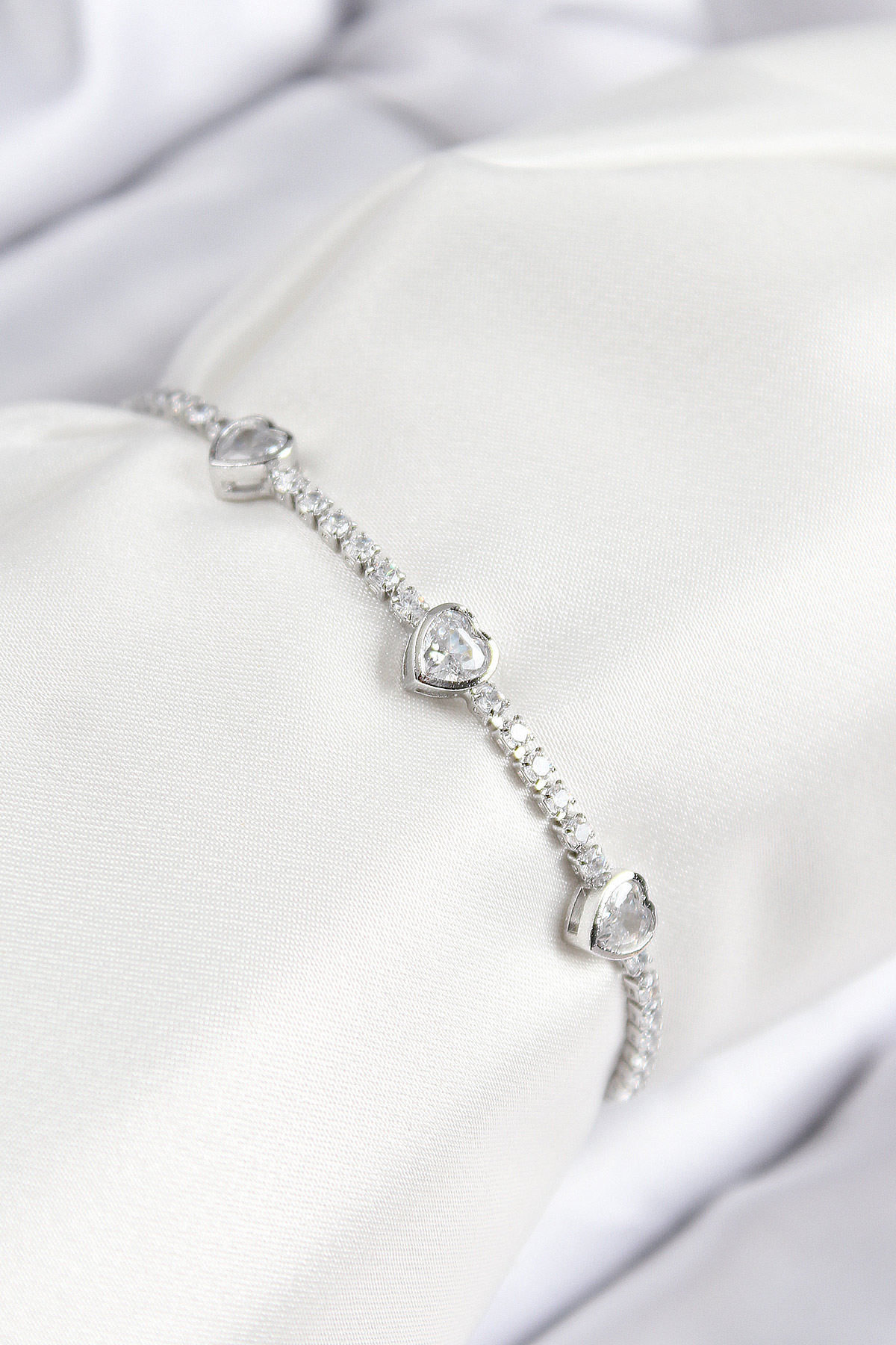 Pirinç Zirkon Taşlı Sıralı Kalp Model Gümüş Renk Asansörlü Kadın Bileklik