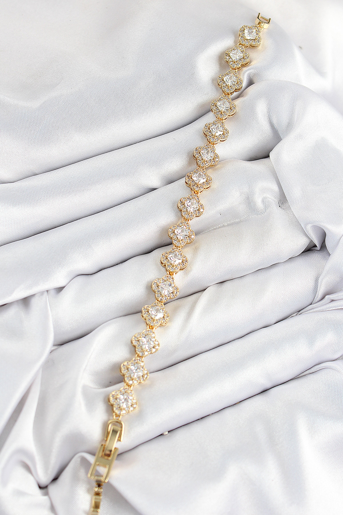 Pirinç Zirkon Taşlı Yonca Baget Model Gold Renk VIP Seri Kadın Bileklik