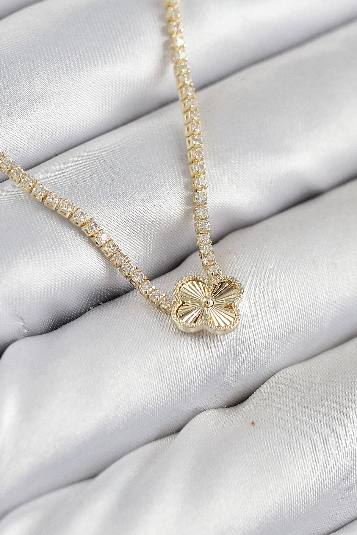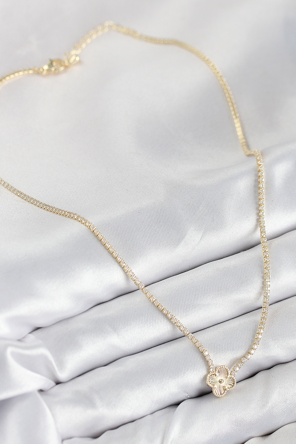 Pirinç Zirkon Taşlı Yonca Model Gold Renk Kadın Kolye