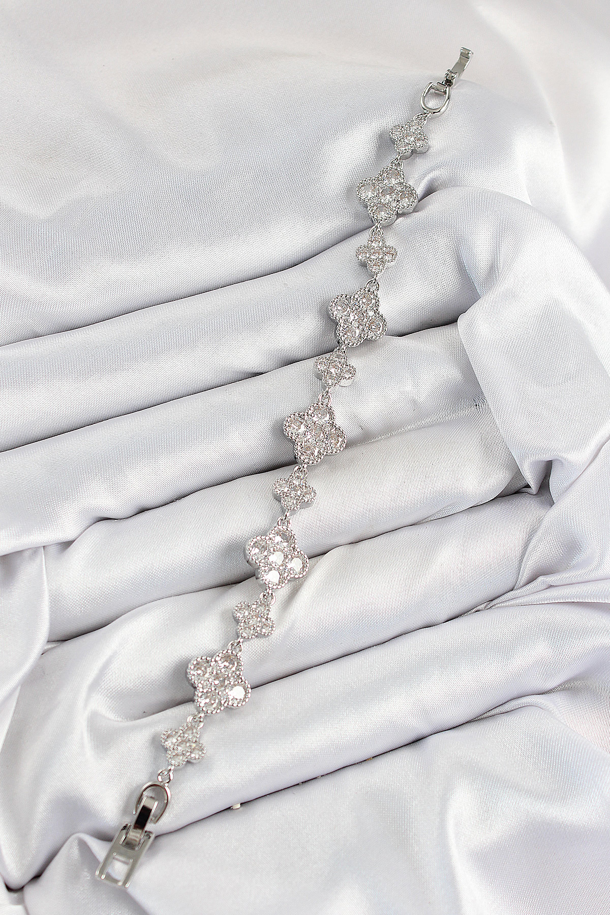 Pirinç Zirkon Taşlı Yonca Model Gümüş Renk VIP Seri Kadın Bileklik