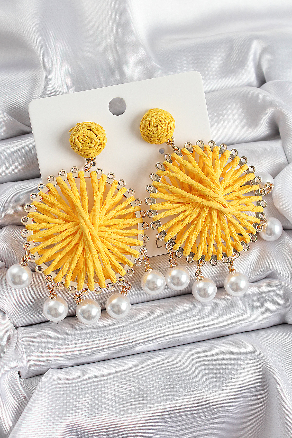 Sarı Hasır Örgü Sarmal Model Sallantılı İnci Detaylı Gold Renk Kadın Küpe