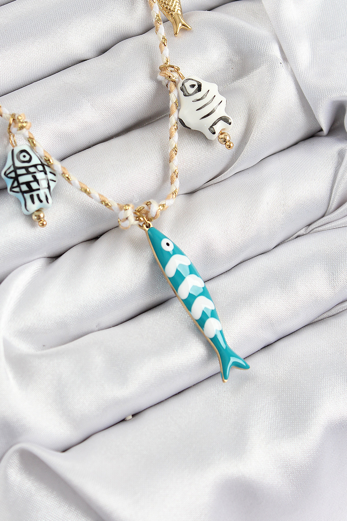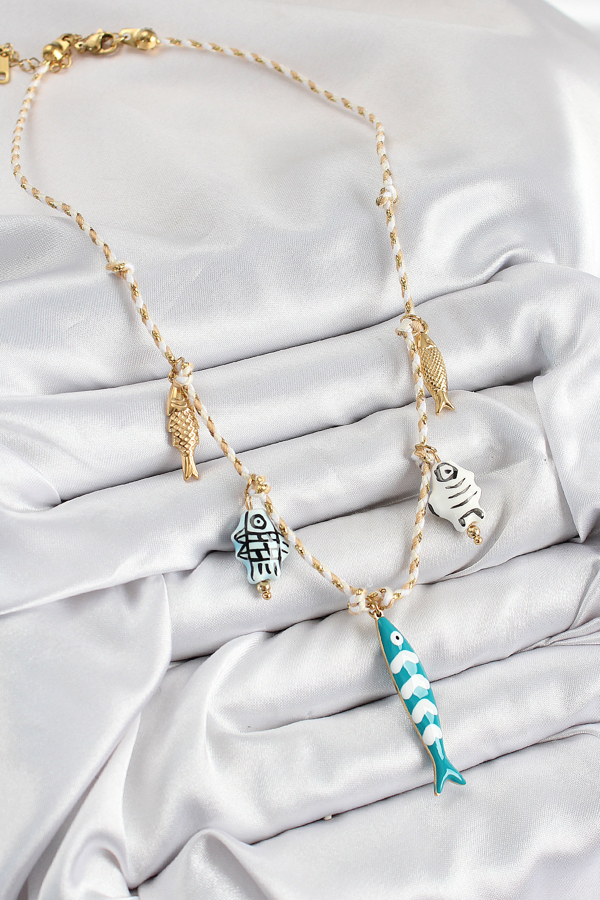 Seramik Motifli Balık Figürlü Model Krem İp Kadın Kolye