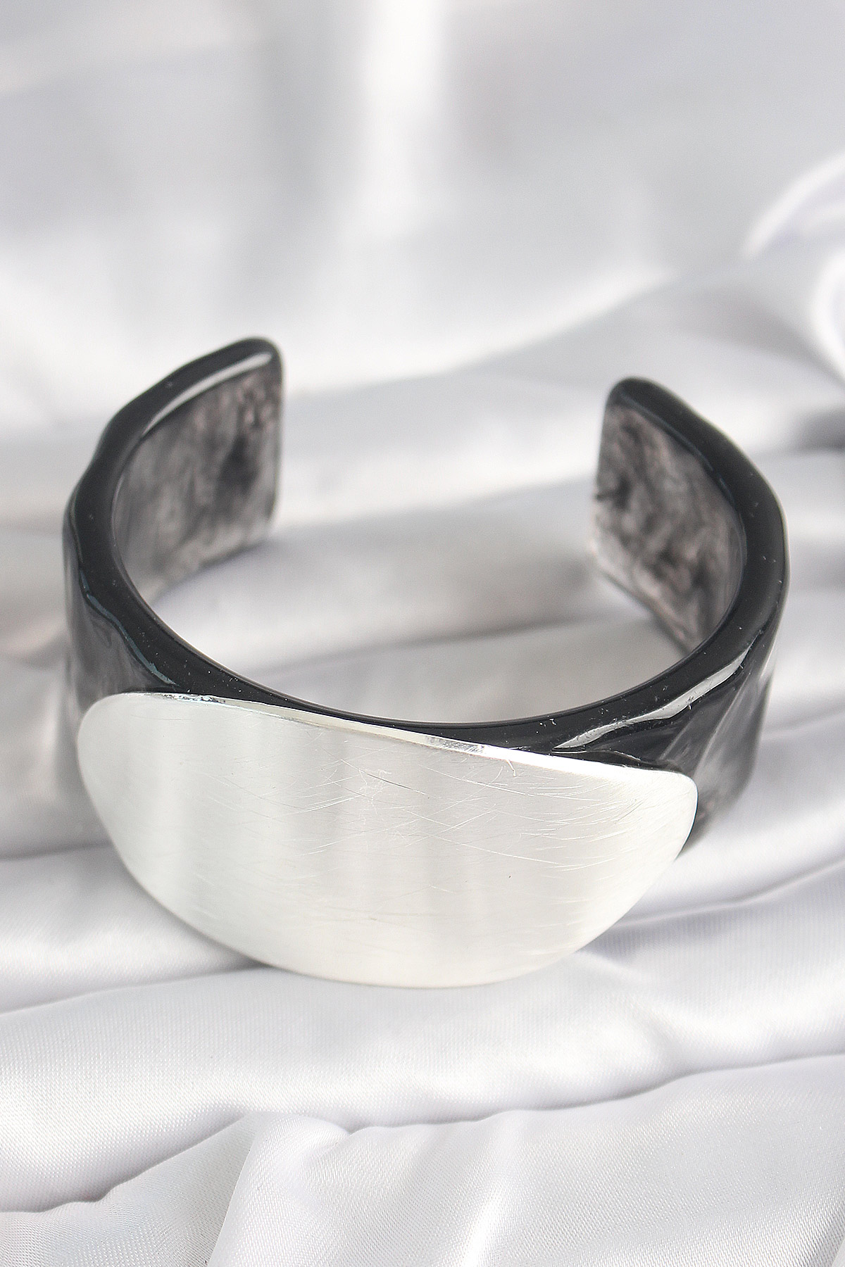 Siyah Mermer Desen Akrilik Plastik Gümüş Oval Plaka Model Vintage Kadın Bilezik