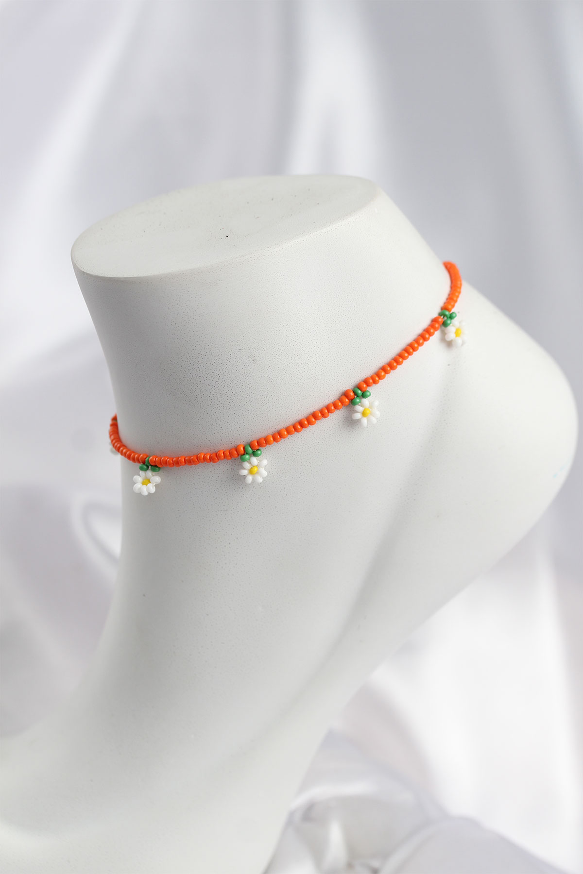 Ürün Özellikleri:Renk: Turuncu ve beyaz papatya detaylıMalzeme: Boncuk ve ipAyarlanabilir uzunlukHafif ve rahat kullanımEl yapımı görünüm