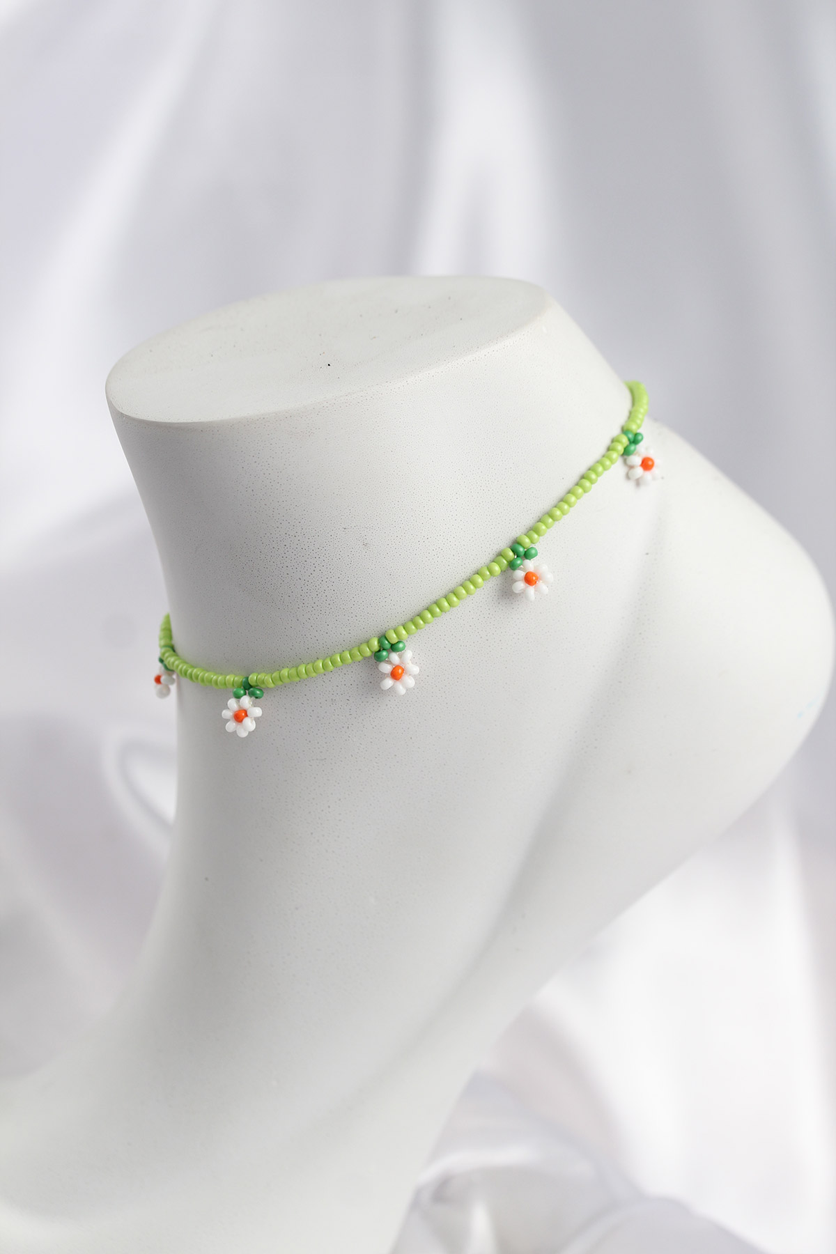 Ürün Özellikleri:Renk: Yeşil ve beyaz papatya detaylıMalzeme: Boncuk ve ipAyarlanabilir uzunlukHafif ve rahat kullanımEl yapımı görünüm